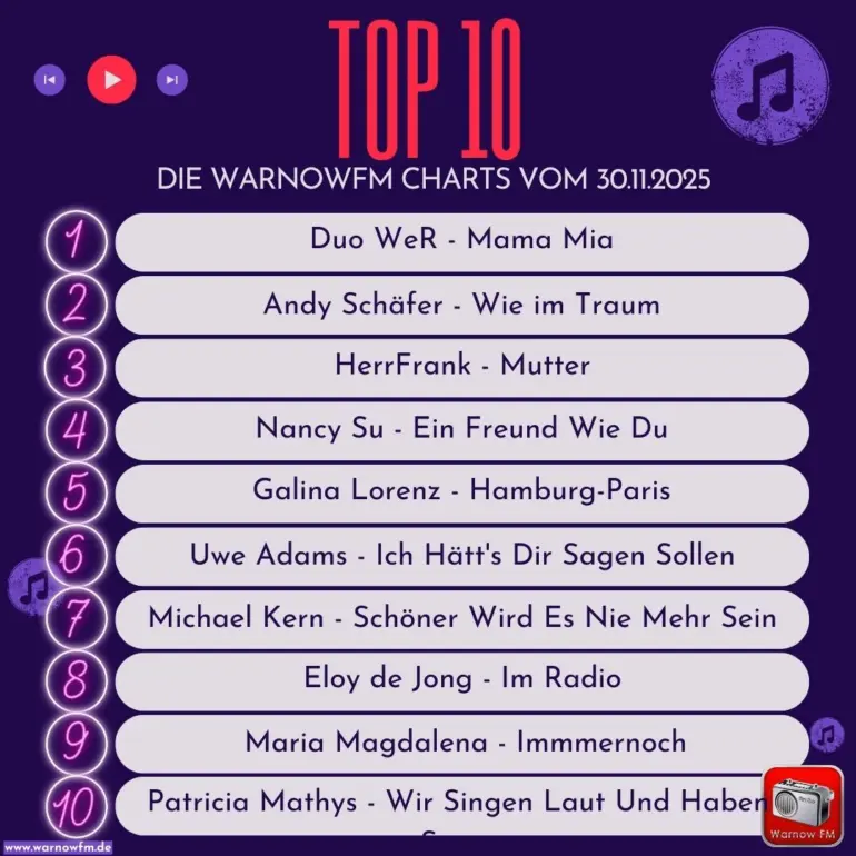 Unsere Hörercharts vom Sonntag den 30.11.2025